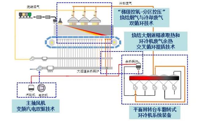 自2014年該課題立項以來,中冶北方以全鏈條燒結工藝為研究對象聚力突破,圍繞“提升冷卻效果、降低生產能耗、高效回收餘熱”sandahexinmubiao,zhenduishaojiegongxudeditandipaiyuyureziyuandegaoxiaohuishouliyong,chixukaizhandaliangjishugongguanyushengchanshijian,chuangzaoxingditichuletijigongrelinian,yanfachu“梯級控氧—分區控壓”燒結煙氣與冷卻廢氣雙循環技術,實現了燒結過程風、熱、氧按需分配,使料層高度方向熱量分布合理、寬度方向供風均勻,煙氣循環量超過30%,固體燃耗降低1.5kg/t以上;開發了燒結大煙道精準取熱和環冷機廢氣餘熱交叉循環提質技術,基於煙(廢)氣流向、refenbushuzhimoni,kaifaledayandaoguoluqureheyanqixunhuanqufengjingzhundingweifangfa,yijidiwenlengquefeiqijiaochaxunhuanjishu,zengjialeyureguoluqureliang,dayandaoyureguolutishengdunkuangfadianliangyue3kW·h,環冷機餘熱噸礦發電量提高至23kW·h,實現燒結礦冷卻廢氣回收率100%;首創了平麵回轉台車翻轉式環冷機係統裝備,研發應用連續平麵回轉體、翻轉式燒結環冷機台車、複合水密封裝置,使冷卻過程有效通風麵積擴大約20%,漏風率降至5%以下,噸燒結礦冷卻電耗降至5.77kW·h;開(kai)發(fa)了(le)主(zhu)抽(chou)風(feng)機(ji)變(bian)頻(pin)汽(qi)電(dian)雙(shuang)驅(qu)技(ji)術(shu),實(shi)現(xian)了(le)汽(qi)輪(lun)機(ji)與(yu)電(dian)動(dong)機(ji)共(gong)同(tong)驅(qu)動(dong)的(de)燒(shao)結(jie)主(zhu)抽(chou)風(feng)機(ji)可(ke)變(bian)頻(pin)調(tiao)速(su)運(yun)行(xing),比(bi)常(chang)規(gui)餘(yu)熱(re)發(fa)電(dian)相(xiang)比(bi)有(you)效(xiao)軸(zhou)功(gong)率(lv)提(ti)升(sheng)5%,比常規工頻汽電雙驅工藝的有效軸功率提升25%,主抽風機低電耗運行,可實現反送電。