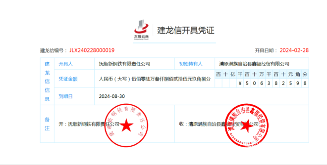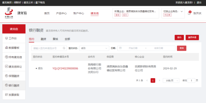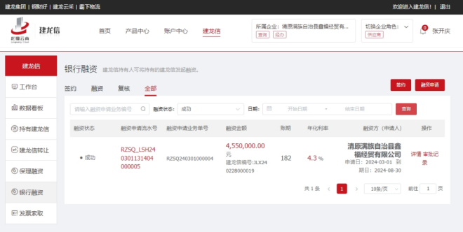 3月1日,建龍集團某供應商持撫順新鋼鐵開具的建龍信,首次從渤海銀行進行線上融資,成功獲得融資455萬元。