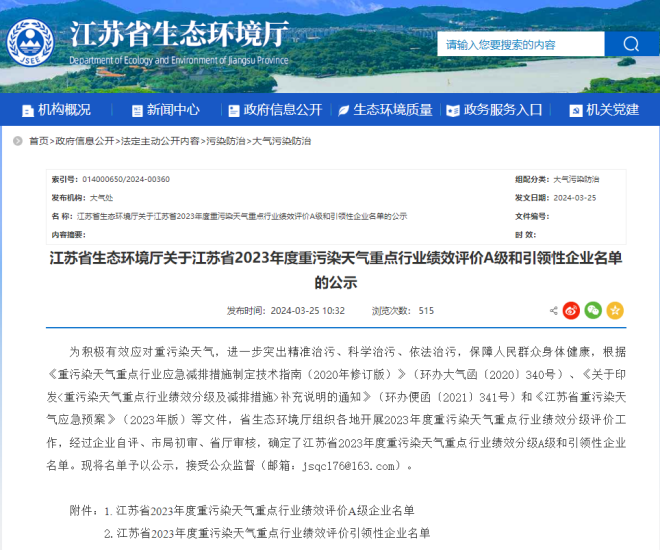 為積極有效應對重汙染天氣,進一步突出精準治汙、科學治汙、依法治汙,保障人民群眾身體健康,根據《重汙染天氣重點行業應急減排措施製定技術指南(2020年修訂版)》(環辦大氣函〔2020〕340號)、《關於印發<重汙染天氣重點行業績效分級及減排措施>補充說明的通知》(環辦便函〔2021〕341號)和《江蘇省重汙染天氣應急預案》(2023年版)等文件,江蘇省生態環境廳組織各地開展2023年度重汙染天氣重點行業績效分級評價工作,經過企業自評、市局初審、省廳審核,確定了江蘇省2023年度重汙染天氣重點行業績效分級A級和引領性企業名單。