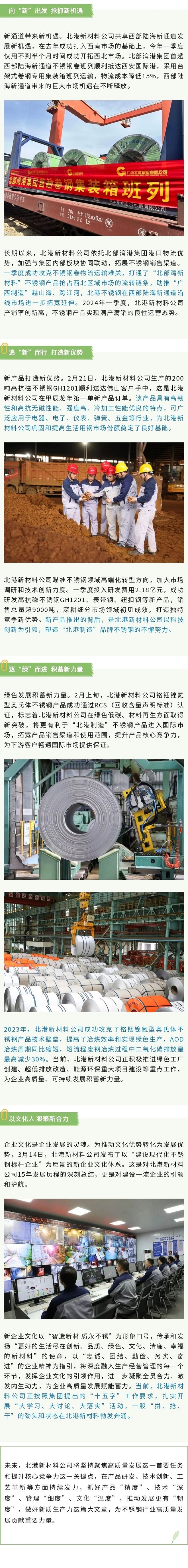 廣西北港新材料有限公司認真貫徹落實一季度經濟工作部署要求,闖市場、搶訂單、忙生產、趕進度,拚出2024年首季“開門紅”,實現利潤同比增長127.9%,各項經營指標穩中向好,交出開局良好答卷,彰顯不鏽鋼產業韌性與活力,邁出發展新質生產力新步伐。(覃英)