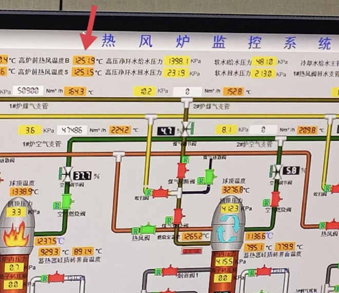 從仙福鋼鐵新建2#高爐主控室熱風爐監控係統可知,此時的熱風爐正在1251.9℃高風溫狀態下安全運行。(夏傑生 攝影)