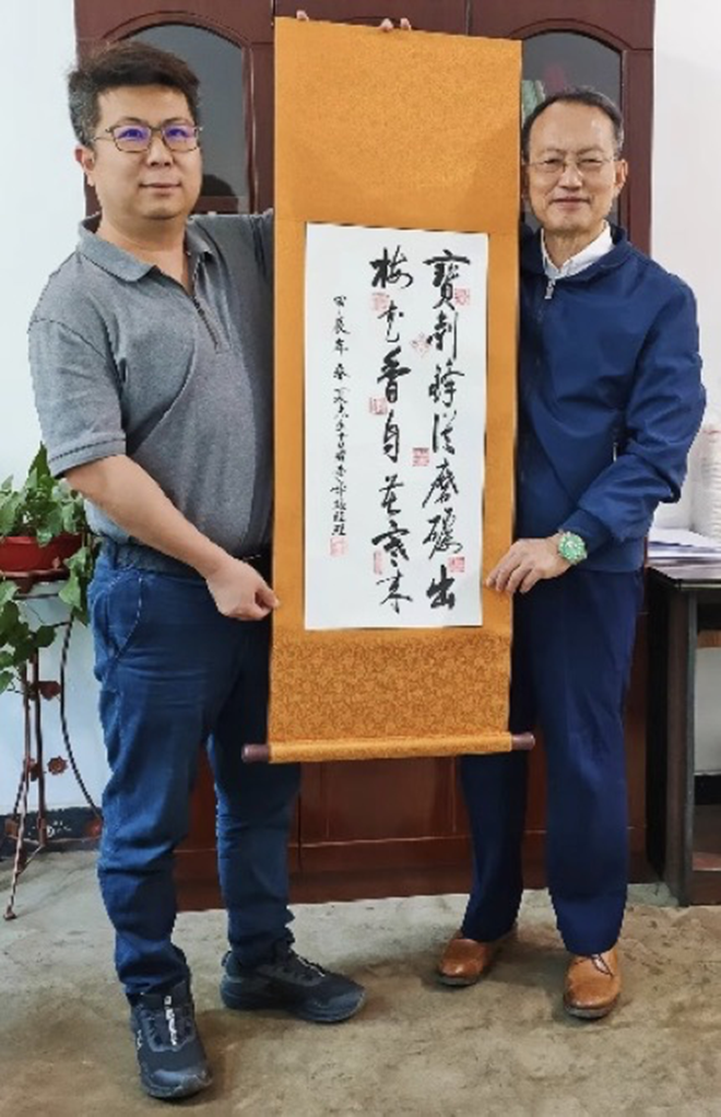 采訪結束後,記者夏傑生代表中國冶金報社向仙福鋼鐵贈送書法作品。(左)為仙福鋼鐵技改指揮部李峰經理。(黃順秋攝影)