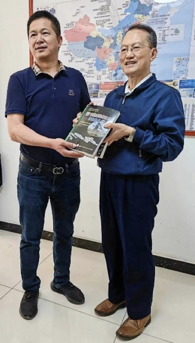 采訪結束後,記者夏傑生代表中國冶金報社向仙福鋼鐵煉鐵廠贈送本社編輯出版的大型冶金科普圖書《鋼鐵工業節能減排新技術5000問》。(左)為仙福鋼鐵煉鐵廠常務副廠長李風寶。(周紅朝攝影)
