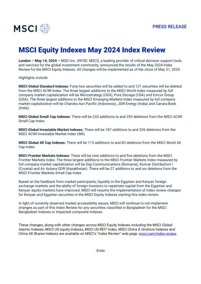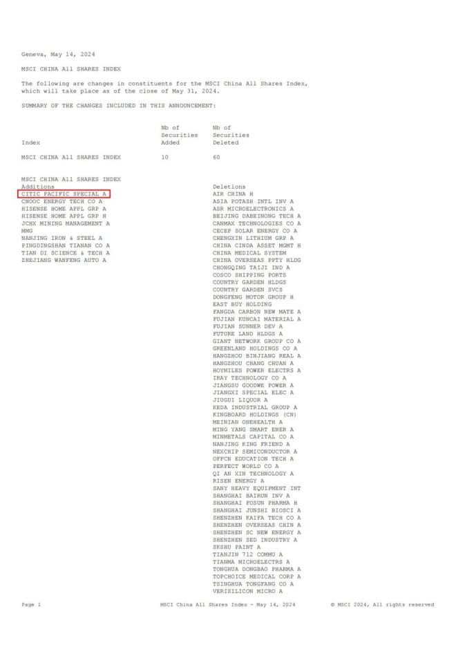 5月15日淩晨,國際指數編製公司MSCI公布了其2024年5月的指數調整結果。本次調整中,MSCI全球標準指數新增42隻個股,其中,中信特鋼(000708.SZ)等8隻A股標的新增納入MSCI中國A股指數。MSCI公告顯示,本次調整結果將於2024年5月31日收盤後生效。