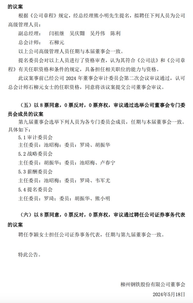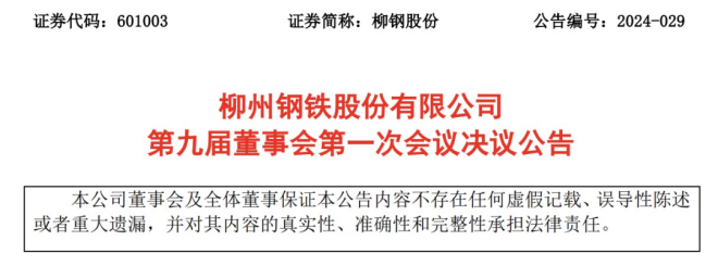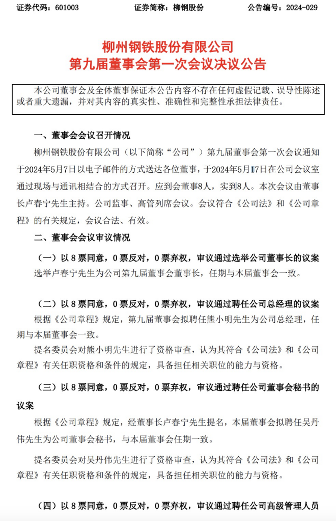 5月18日,柳鋼股份發布了《柳州鋼鐵股份有限公司第九屆董事會第一次會議決議公告》(以下簡稱《公告》)。