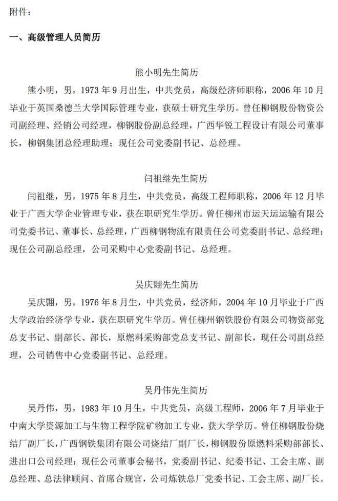 熊小明,男,1973年9月出生,中共黨員,高級經濟師職稱,2006年10月畢業於英國桑德蘭大學國際管理專業,獲碩士研究生學曆。曾任柳鋼股份物資公司副經理、經銷公司經理,柳鋼股份副總經理,廣西華銳工程設計有限公司董事長,柳鋼集團總經理助理;現任公司黨委副書記、總經理。