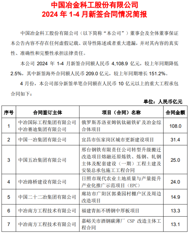 5月14日,中國中冶發布了《中國中冶2024年1月-4月經營情況簡報》。根據公告顯示:2024年1月-4月,中國中冶集團新簽合同額4,108.9億,同比降低2.5%。新簽海外合同額人民幣209.0億元,較上年同期增長151.2%。