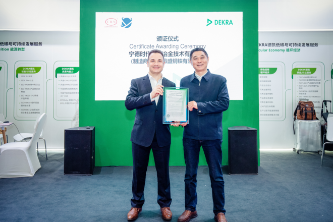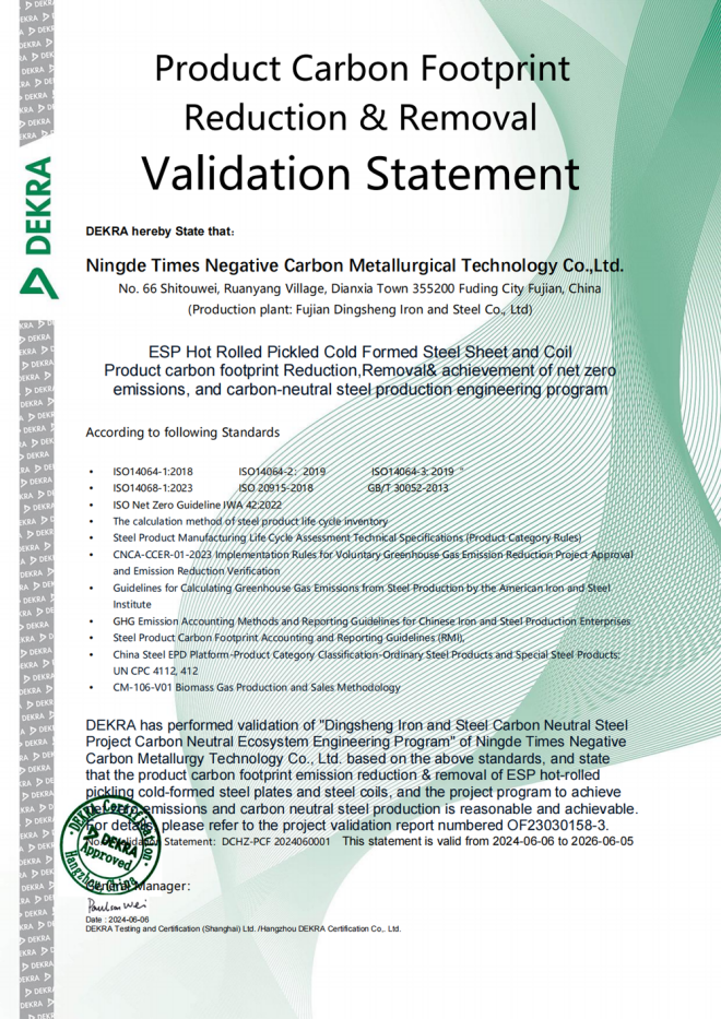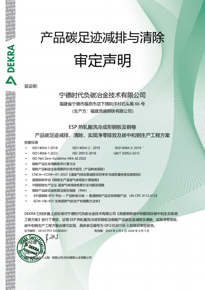 據DEKRA德凱官網消息,6月7日上海碳博會期間,德國DEKRA德凱為深圳碳中和寧德時代負碳冶金技術有限公司頒發ESP熱軋酸洗冷成型鋼板及鋼卷“產品碳足跡減排與清除審定聲明”,標誌著深圳碳中和與鼎盛鋼鐵實施碳中和鋼產品工程計劃,順利走完第二步。