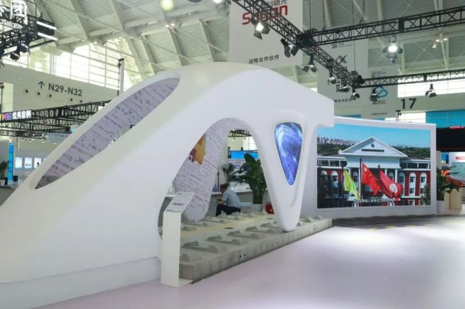 展區裏,現代感、科技感撲麵而來。地麵繪製了公路、鐵路和水麵圖案,創新展示“公鐵水”多式聯運模式,構建低碳交通運輸體係。“榮程號”動車頭模型應用榮程鋼鐵集團預應力線材,這是國內高速鐵路的重要基礎建設材料,象征著榮程技術、榮程速度。