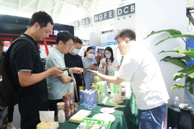 參觀者在榮程健康產品展台前互動交流