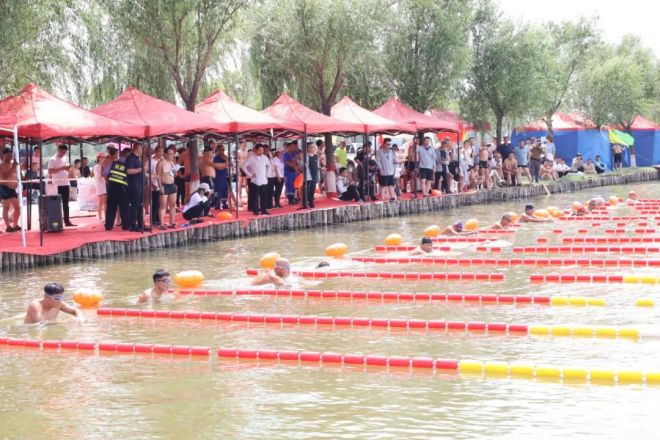 在太子湖重鋼別墅西側水域,100餘名遊泳愛好者不限泳姿同台競技,在水上展開了100米、200米、300米“速度與激情”的較量。比賽中,選手們劈波斬浪、“泳”往直前,劃水、收手、伸臂、滑行……動作一氣嗬成,湖麵不時翻起道道浪花,現場加油聲此起彼伏,氣氛十分熱烈。經過數輪角逐,最終王智強包攬300米、200米和100米三項冠軍。