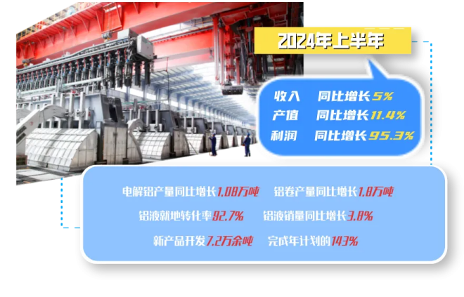 上半年,東興鋁業公司電解鋁、鋁卷產量分別同比增長1.08萬噸、1.8萬噸,收入同比增長5%,工業總產值同比增長11.4%,利潤同比增長95.3%。