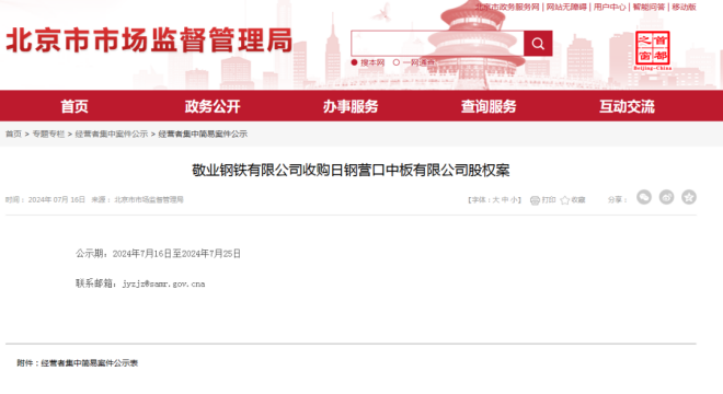 7月16日,北京市市場監督管理局發布了《敬業鋼鐵有限公司收購日鋼營口中板有限公司股權案》的案件公示。該公示中提到,敬業鋼鐵有限公司與日照鋼鐵控股集團有限公司訂立《股權轉讓合同》,約定收購日照鋼鐵持有的日鋼營口中板有限公司(以下簡稱“日鋼營口”)100%的股權。交易後,敬業鋼鐵將持有日鋼營口100%的股份,單獨控製日鋼營口。
