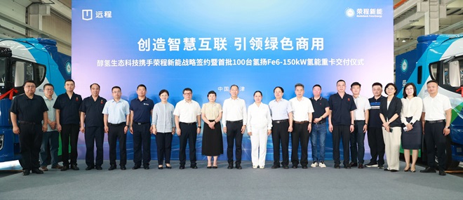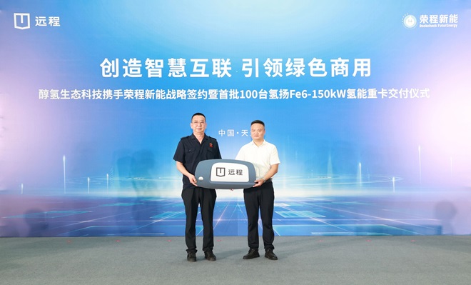 8月6日,榮程新能集團攜手醇氫生態科技戰略簽約暨首批100台氫能重卡交付儀式在吉利遠程新能源商用車天津生產基地隆重舉行。此次遠程向榮程交付的氫燃料重卡,搭載了榮程氫揚動力Fe6-150kw氫燃料電池係統,具備大功率、長續航、低功耗特點,將陸續投入到京津冀環渤海區域省際幹線物流及鋼鐵、港口等大宗物資運輸場景,助力京津冀綠色運力升級。這也意味著榮程新能累計投運氫能重卡數量將達到459輛,繼續在國內氫能重卡運輸領域領跑。