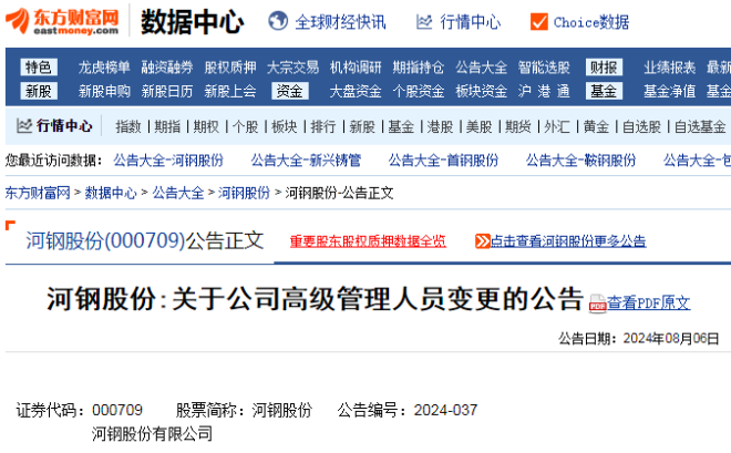 8月7日,河鋼股份發布了《關於公司高級管理人員變更的公告》(以下簡稱“公告”)。