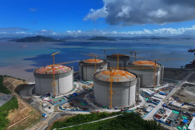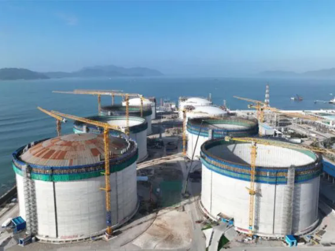 LNG儲罐設計建造是能源領域的尖端技術之一。寧波“綠能港”三期LNG儲罐項目,位於穿山半島公鵝咀地塊,是國家石油天然氣基礎設施重點工程。該項目於2022年開工,主要建設6座27萬立方米LNG儲罐及配套設施。本次完成升頂的LNG儲罐高 62.6 米,直徑近百米,罐容 27 萬立方米,存儲 1.69 億立方米天然氣。這是當前全球容量最大的LNG儲罐。