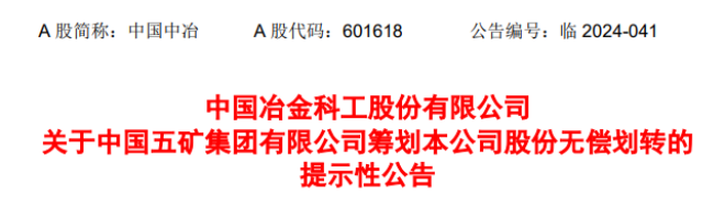 8月27日,中國中冶發布了《中國中冶關於中國五礦集團有限公司籌劃本公司股份無償劃轉的提示性公告》(以下簡稱《公告》)。