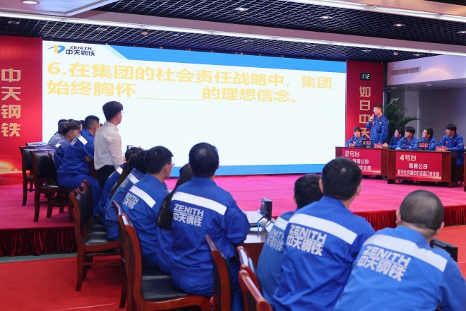 本次競賽設有必答題、搶答題、風險題三種類型,考題涵蓋《中天鋼鐵集團企業文化綱領手冊(V2.0)》等內容。現場,參賽選手信心滿滿、全情投入,在比拚知識儲備的同時,更凸顯團隊的謀略和配合,現場觀眾不時報以熱烈掌聲。