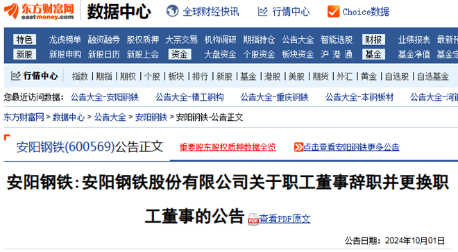 10月1日,安陽鋼鐵(600569)發布了《安陽鋼鐵股份有限公司關於高級管理人員辭職並更換高級管理人員的公告》與《安陽鋼鐵股份有限公司關於職工董事辭職並更換職工董事的公告》。