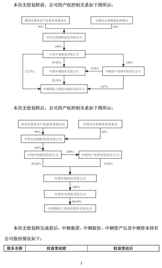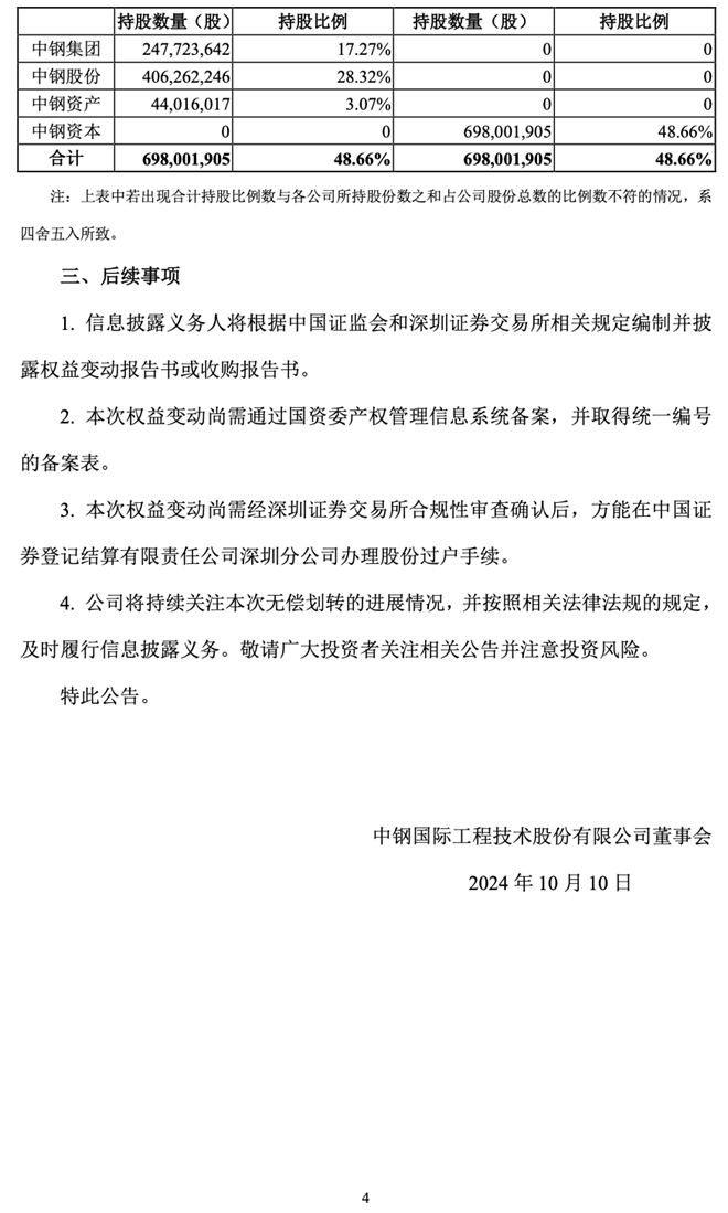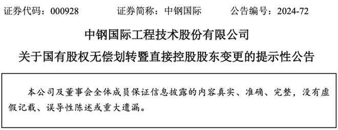中鋼國際工程技術股份有限公司(000928)(以下簡稱“公司”)於10月10日晚間發布《關於國有股權無償劃轉暨直接控股股東變更的提示性公告》(以下簡稱《公告》),公司控股股東中國中鋼集團有限公司及其下屬子公司中國中鋼股份有限公司、中鋼資產管理有限責任公司擬將合計持有的公司6.98億股股份(占中鋼國際股份總數的48.66%)無償劃轉給中鋼股份的全資子公司中鋼資本控股有限公司。