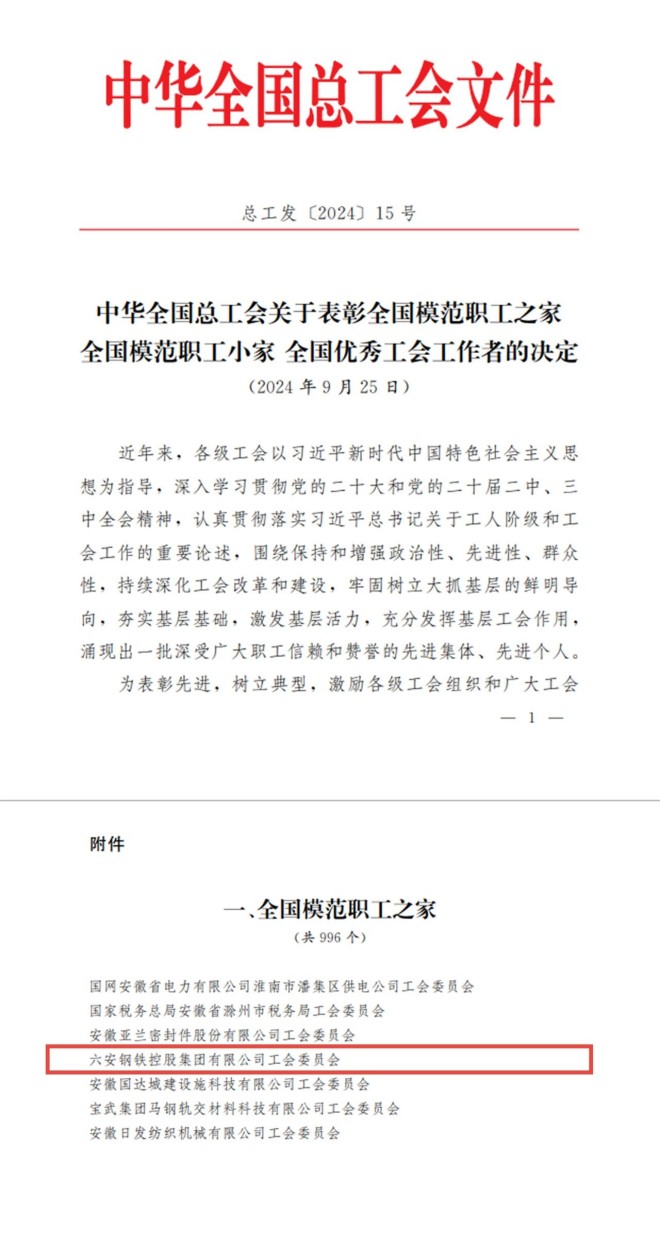 近日,中華全國總工會下發《關於表彰全國模範職工之家全國模範職工小家全國優秀工會工作者的決定》(總工發〔2024〕15號),六安鋼鐵控股集團有限公司工會委員會榮獲“全國模範職工之家”榮譽稱號。