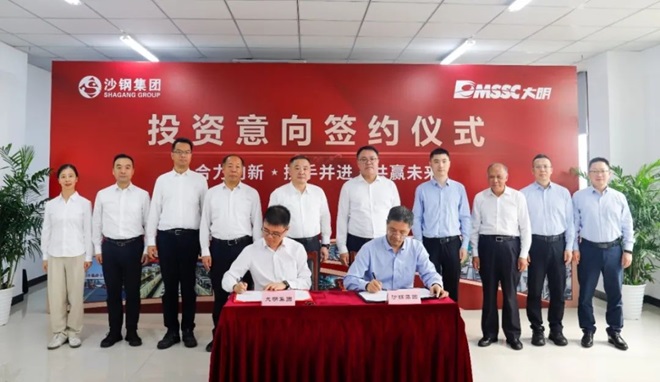 10月15日,沙鋼集團黨委書記、董事長沈彬,沙鋼集團常務執行董事、副總裁、沙鋼鋼鐵有限公司總經理施一新,沙鋼鋼鐵有限公司副總經理王科,沙鋼集團總裁助理、沙鋼投資控股有限公司董事長錢正等到大明國際參觀交流,並進行投資意向簽約。大明國際董事會主席周克明、副主席鄒曉平,常務副總裁錢立,大明重工總裁陳寧等熱情接待。