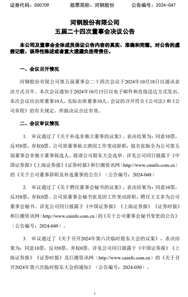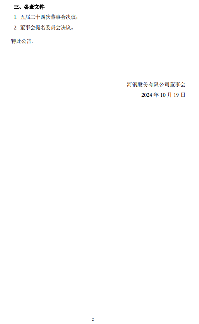 從《公告》中獲悉,2024年10月18日,河鋼股份有限公司召開五屆二十四次董事會,審議通過了《關於補選公司非獨立董事的議案》,公司原董事耿立唐因工作變動辭職,提名張振全為公司第五屆董事會非獨立董事候選人。審議通過了《關於聘任公司董事會秘書的議案》,公司原董事會秘書張龍因工作變動辭職,聘任王文多為公司董事會秘書。