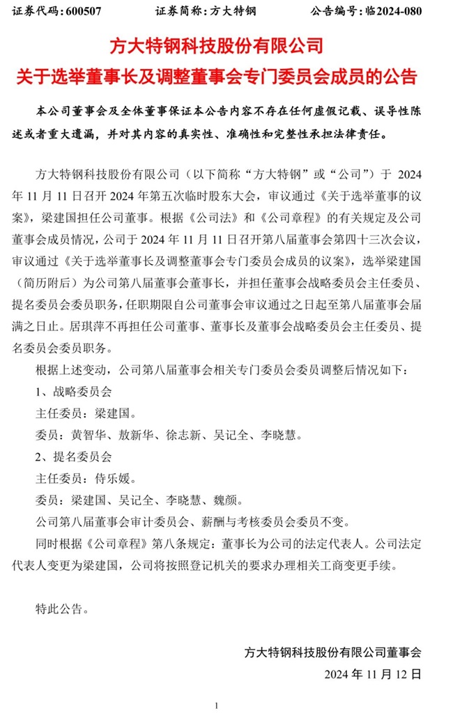 方大特鋼11月11日晚間公告,公司於2024年11月11rizhaokaidibajiedongshihuidisishisancihuiyi,shenyitongguoxuanjuliangjianguoweigongsidibajiedongshihuidongshichangdeyian,liangjianguotongshidanrendongshihuizhanlveweiyuanhuizhurenweiyuanhetimingweiyuanhuiweiyuan。cicibiandonghou,gongsidongshihuizhanlveweiyuanhuihetimingweiyuanhuichengyuanyousuotiaozheng,juqipingbuzaidanrenxiangguanzhiwu。