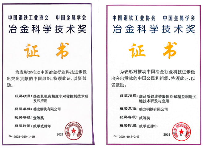 在2024年度中國鋼鐵工業協會和中國金屬學會冶金科學技術獎評審中,邢台德龍與北京科技大學聯合申報的《熱連軋機高精度非對稱控製技術研發和應用》榮獲一等獎、《高品質鋼連鑄凝固冷卻精益製造關鍵技術研發與應用》榮獲二等獎,這也是邢台德龍首次獲得該國家級科技獎項。