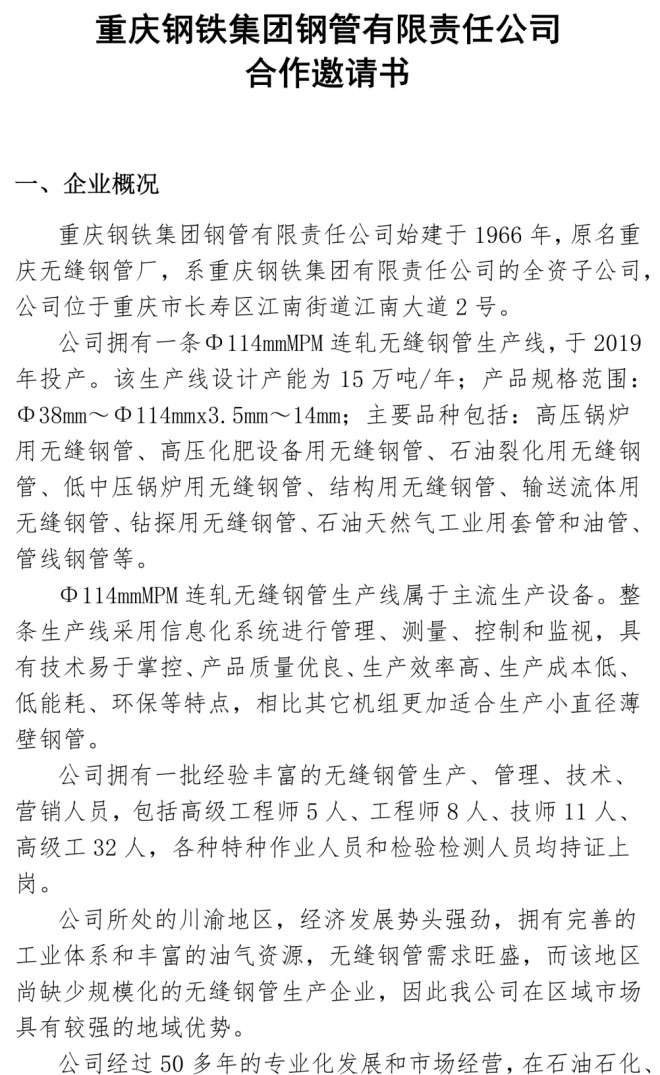 重慶鋼鐵集團鋼管有限責任公司合作邀請書