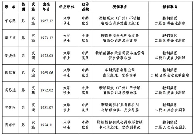 鞍鋼集團有限公司7名擬任職領導人員名單