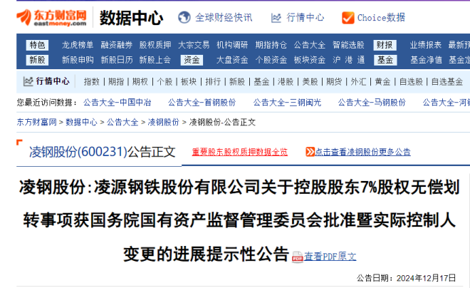淩鋼股份12月16日晚公告,公司於12月16日收到控股股東淩鋼集團告知函:鞍鋼集團收到國務院國有資產監督管理委員會(簡稱“國務院國資委”)下發的批複,同意鞍鋼集團無償劃入遼寧省朝陽市國資委持有的淩鋼集團7%股權。