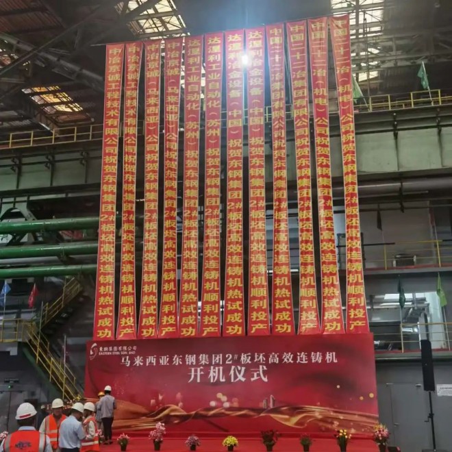 2023年10月15日,馬來西亞東鋼二期連鑄項目投產儀式,連鑄廠房布置率比原來增加了50%,最大限度利用現有設施,真正做到了布置合理、工藝順暢、節約投資。