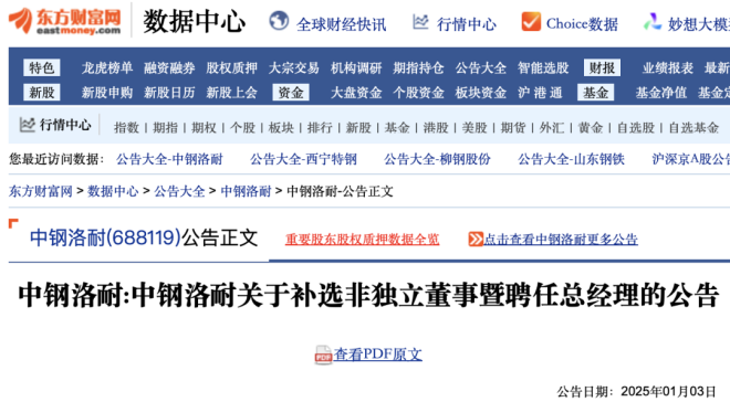 1月3日,中鋼洛耐發布《關於補選非獨立董事暨聘任總經理的公告》(以下簡稱《公告一》。