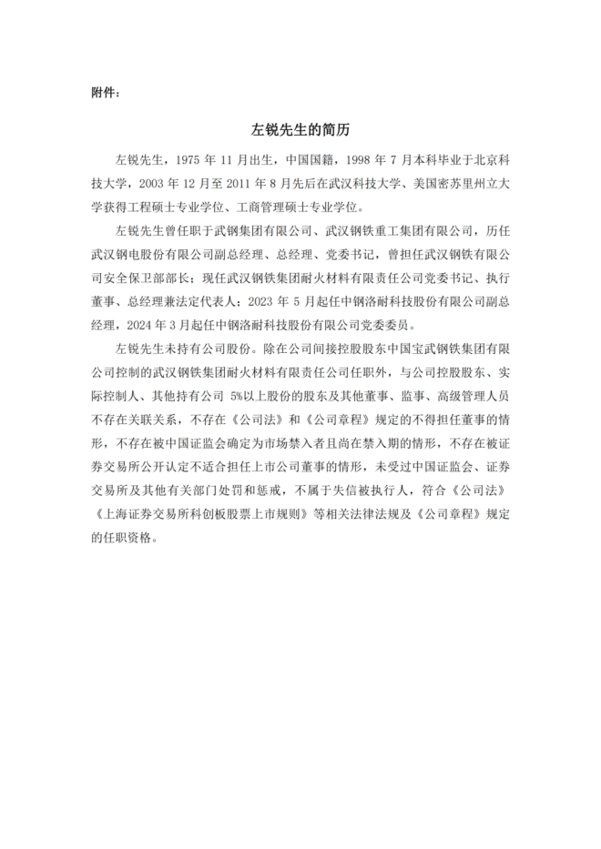 左銳先生曾任職於武鋼集團有限公司、武漢鋼鐵重工集團有限公司,曆任武漢鋼電股份有限公司副總經理、總經理、黨委書記,曾擔任武漢鋼鐵有限公司安全保衛部部長;現任武漢鋼鐵集團耐火材料有限責任公司黨委書記、執行董事、總經理兼法定代表人;2023年5月起任中鋼洛耐科技股份有限公司副總經理,2024年3月起任中鋼洛耐科技股份有限公司黨委委員。