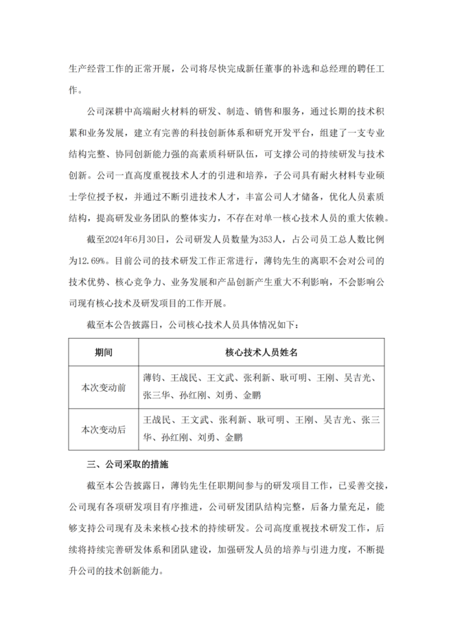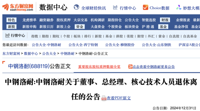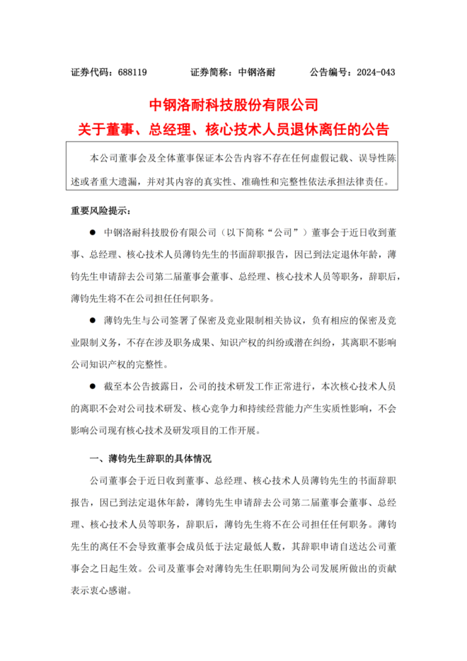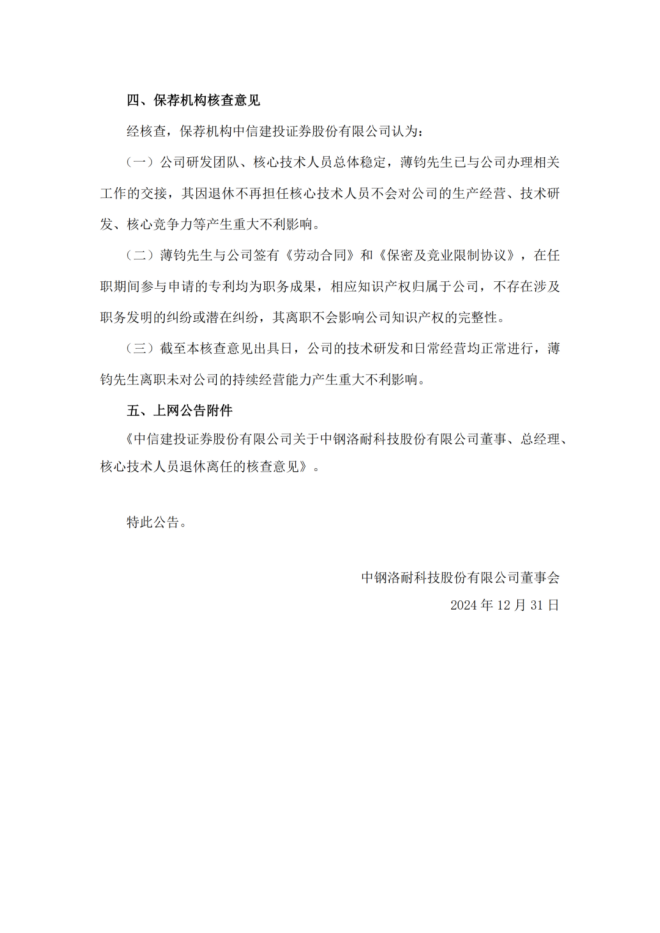2024年12月31日,中鋼洛耐發布《關於董事、總經理、核心技術人員退休離任的公告》(以下簡稱《公告二》。