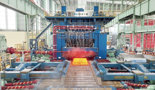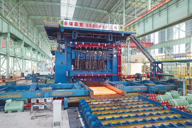 2024年10月31日,由中冶京誠工程技術有限公司(以下簡稱中冶京誠)自主設計供貨的全球最寬厚板軋機——周口鋼鐵5600毫米寬厚板粗軋機熱負荷試車,軋製出第一塊寬厚板,這是全球鋼鐵極限製造領域的又一次成功跨越,標誌著世界寬厚板軋機邁入5600毫米新時代。