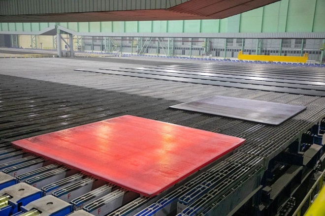 1月24日,河南鋼鐵集團周口基地二期寬厚板生產現場機器轟鳴、熱浪灼人,火紅的鋼坯經過“世界最寬5600mm軋機”的多道軋製,寬度達5350mm的板材成功下線。經檢驗,各項指標均符合要求,標誌著周口基地5600mm軋機的軋製寬度達到了設計能力。