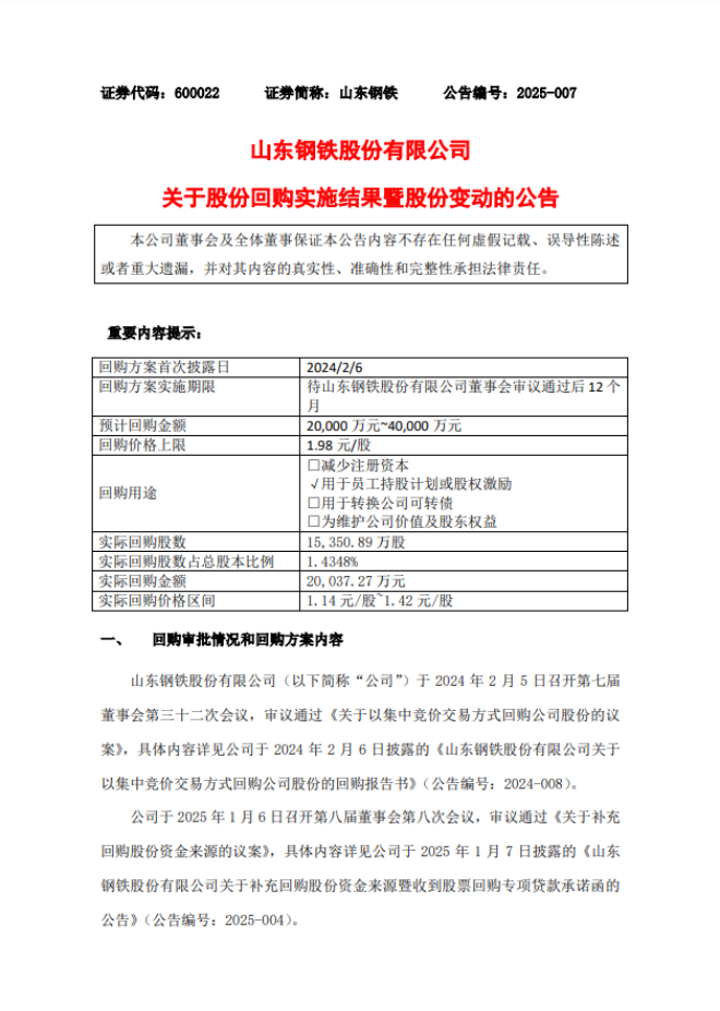 從《公告》中獲悉,山東鋼鐵股份有限公司於2024年2月5日召開第七屆董事會第三十二次會議審議通過回購股份議案,於2025年1月6日召開第八屆董事會第八次會議補充回購股份資金來源。2024年3月22日施行首次回購,2025年2月4日完成回購,實際回購公司股份1.54億股,占總股本的1.4348%,成交最低價為1.14元/股,最高價為1.42元/股,總金額為2億yi元yuan。回hui購gou期qi間jian除chu控kong股gu股gu東dong增zeng持chi外wai,董dong事shi等deng相xiang關guan主zhu體ti無wu買mai賣mai公gong司si股gu票piao的de情qing況kuang。本ben次ci回hui購gou股gu份fen存cun於yu專zhuan用yong賬zhang戶hu,將jiang用yong於yu股gu權quan激ji勵li,未wei用yong部bu分fen將jiang依yi法fa注zhu銷xiao。