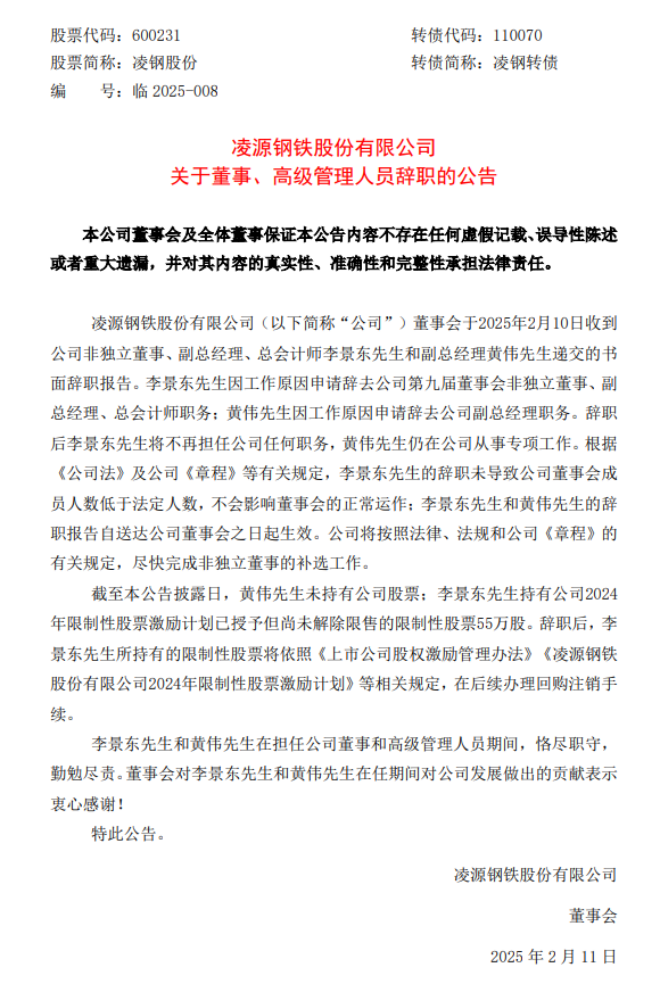 公告顯示,淩源鋼鐵股份有限公司(以下簡稱“公司”)董事會於2025年2月10日收到公司非獨立董事、副總經理、總會計師李景東先生和副總經理黃偉先生遞交的書麵辭職報告。李景東先生因工作原因申請辭去公司第九屆董事會非獨立董事、副總經理、總會計師職務;黃偉先生因工作原因申請辭去公司副總經理職務。辭職後李景東先生將不再擔任公司任何職務,黃偉先生仍在公司從事專項工作。