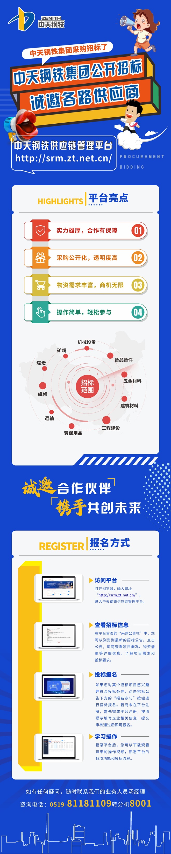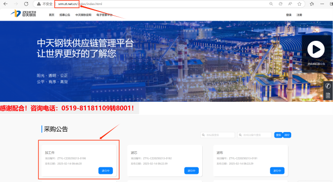 為了進一步提升廣大供應商的參與便捷度,集團不斷簡化“中天鋼鐵供應鏈管理平台”的操作流程。供應商通過瀏覽器訪問“http://srm.zt.net.cn/”網址,即可查看“采購公告欄”中(zhong)的(de)招(zhao)標(biao)項(xiang)目(mu)詳(xiang)情(qing),並(bing)自(zi)由(you)選(xuan)擇(ze)感(gan)興(xing)趣(qu)的(de)項(xiang)目(mu)報(bao)名(ming)。平(ping)台(tai)提(ti)供(gong)清(qing)晰(xi)的(de)報(bao)名(ming)提(ti)示(shi)和(he)操(cao)作(zuo)指(zhi)南(nan),以(yi)及(ji)一(yi)對(dui)一(yi)的(de)專(zhuan)業(ye)指(zhi)導(dao),幫(bang)助(zhu)新(xin)供(gong)應(ying)商(shang)快(kuai)速(su)熟(shu)悉(xi)流(liu)程(cheng),順(shun)利(li)開(kai)始(shi)合(he)作(zuo)。