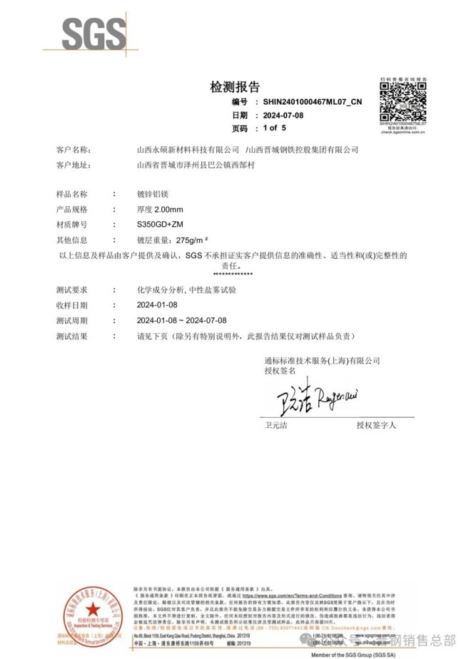 晉鋼鋅鋁鎂通過權威機構SGS第三方鹽霧試驗6000小時測試,為晉鋼鋅鋁鎂產品應用於實地環境提供了有力的事實依據。應用於此項目可以正常出具30年使用壽命的質保,得到了項目方的認可。