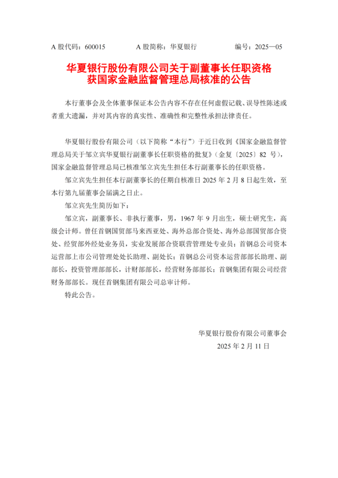其中顯示,華夏銀行股份有限公司(以下簡稱“本行”)於近日收到《國家金融監督管理總局關於鄒立賓華夏銀行副董事長任職資格的批複》(金複〔2025〕82 號),國家金融監督管理總局已核準鄒立賓先生擔任本行副董事長的任職資格。