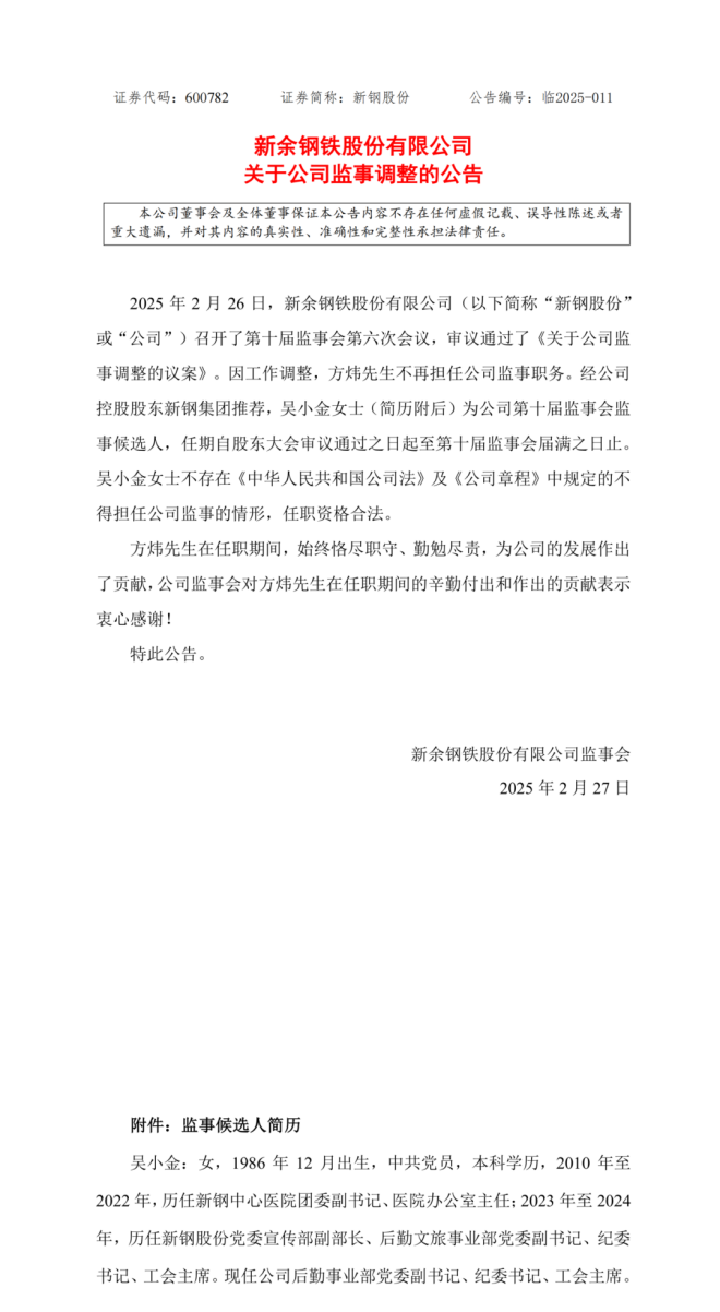 其中顯示,2025 年 2 月 26 日,新餘鋼鐵股份有限公司(以下簡稱“公司”)召開了第十屆監事會第六次會議,審議通過了《關於公司監事調整的議案》。因yin工gong作zuo調tiao整zheng,方fang煒wei先xian生sheng不bu再zai擔dan任ren公gong司si監jian事shi職zhi務wu。經jing公gong司si控kong股gu股gu東dong新xin鋼gang集ji團tuan推tui薦jian,吳wu小xiao金jin女nv士shi為wei公gong司si第di十shi屆jie監jian事shi會hui監jian事shi候hou選xuan人ren,任ren期qi自zi股gu東dong大da會hui審shen議yi通tong過guo之zhi日ri起qi至zhi第di十shi屆jie監jian事shi會hui屆jie滿man之zhi日ri止zhi。
