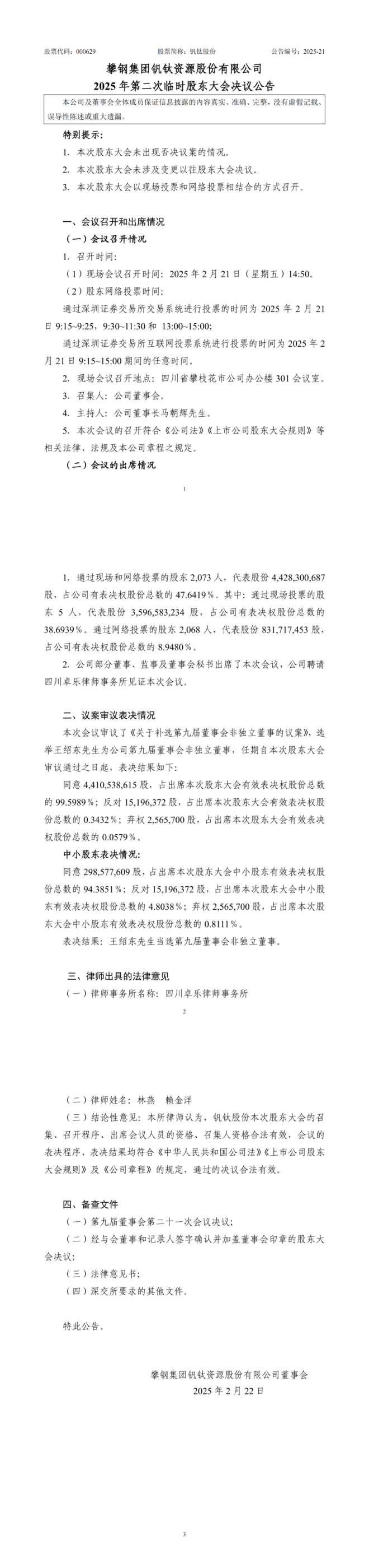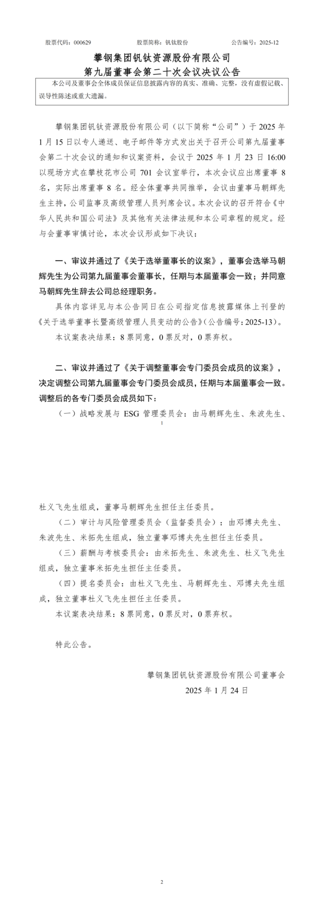 其中提到,攀鋼集團釩鈦資源股份有限公司(以下簡稱“公司”)2025 年第二次臨時股東大會審議通過了《關於補選第九屆董事會非獨立董事的議案》,補選王紹東先生為公司第九屆董事會非獨立董事;第九屆董事會第二十次會議審議並通過了《關於選舉董事長的議案》,選舉馬朝輝先生為公司第九屆董事會董事長;第九屆董事會第二十一次會議審議並通過了《關於聘任總經理及補選董事的議案》,聘任王紹東先生為公司總經理。 具體情況詳見公司有關公告。