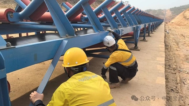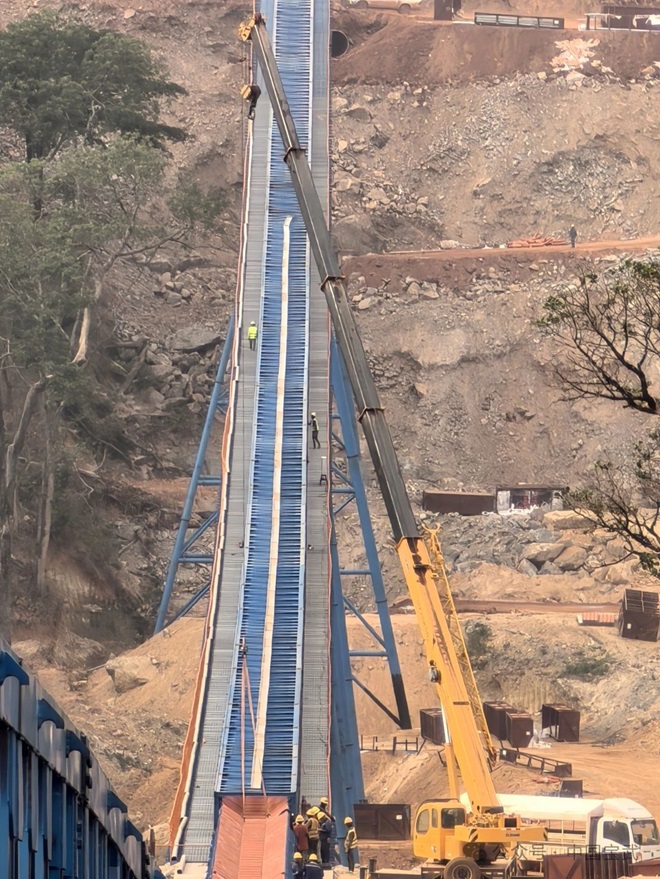 由於地形險峻複雜,礦石下山膠帶麵臨施工難度大與安全風險等多重挑戰。其中,CV2段17#至34#立柱段需橫跨深度達35米的陡峭山穀,是該段施工的最大難點,關係著整體工期的進度。在保證作業人員安全、工程質量過硬的前提下,為了保障工程進度,礦山公司設備部主動請纓承擔這部分的急難工程,經過周密策劃、精心組織,實行分班作業,安全、設備管理團隊全力配合安排專業團隊駐場督導,每次作業啟動前進行危險源動態排查,包括全麵檢查施工區域的地質條件、設備狀況、人員防護等,在作業過程中嚴格閉環管控,做到質量不鬆懈、安全無漏洞。最終,用時60天,這段懸架山穀的“飛虹”高質量完成了傳輸帶上的重要拚圖,為最後的穿帶膠結贏得了寶貴時間,成為礦山“百日會戰”的又一個新亮點。