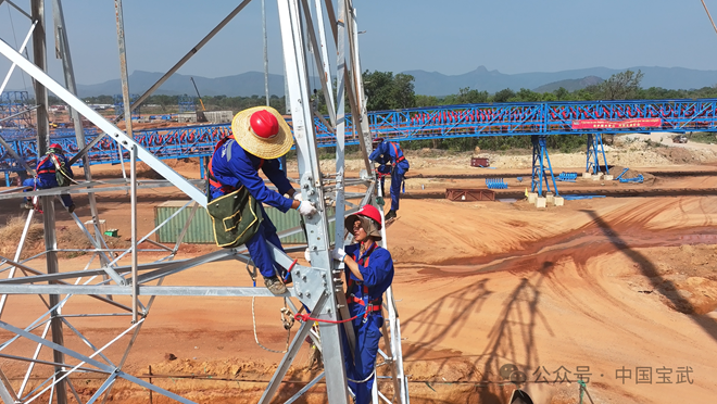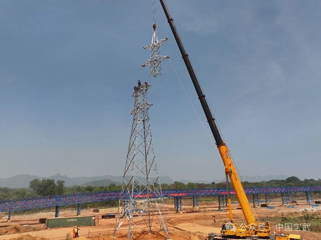 在做好所有前期場地、物料、人員等準備工作後,技術人員進行了詳細的技術交底,於14日開始進行組立工作。在克服雷暴雨、烈日、大風等不利影響後,建設團隊於15日上午順利完成四、五段吊裝,率先組立B線路24基中的第9基——BN9鐵塔。該鐵塔共五段,總高32米,總重10.4噸,僅螺栓就有半噸重。目前其他鐵塔組立安裝工作穩步推進。
