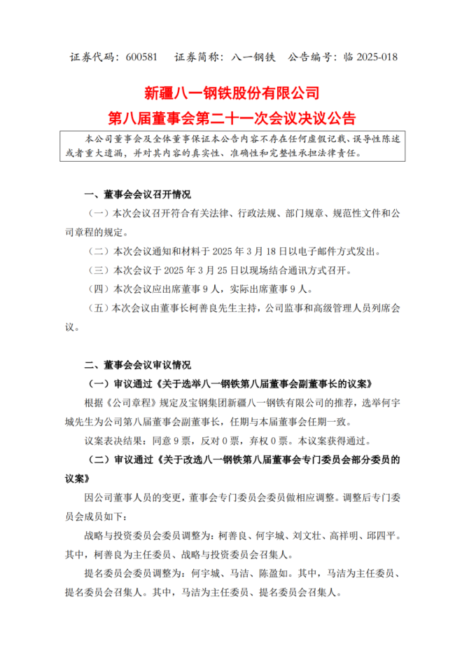 公告顯示,根據《公司章程》規定及寶鋼集團新疆八一鋼鐵有限公司的推薦,選舉何宇城先生為該公司第八屆董事會副董事長。