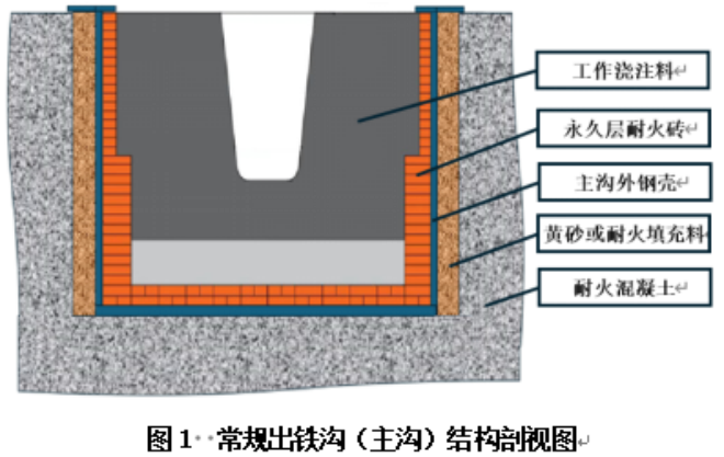現常規高爐出鐵溝(主溝)結構見下圖1。主(zhu)溝(gou)鋼(gang)殼(ke)與(yu)耐(nai)火(huo)混(hun)凝(ning)土(tu)之(zhi)間(jian)會(hui)填(tian)充(chong)黃(huang)砂(sha)或(huo)耐(nai)火(huo)填(tian)充(chong)料(liao),鋼(gang)殼(ke)內(nei)部(bu)永(yong)久(jiu)層(ceng)采(cai)用(yong)耐(nai)火(huo)磚(zhuan)砌(qi)築(zhu),最(zui)後(hou)澆(jiao)注(zhu)主(zhu)溝(gou)工(gong)作(zuo)層(ceng)澆(jiao)注(zhu)料(liao)。這(zhe)樣(yang)結(jie)構(gou)的(de)主(zhu)溝(gou)由(you)於(yu)鋼(gang)殼(ke)埋(mai)於(yu)黃(huang)砂(sha)和(he)耐(nai)火(huo)材(cai)料(liao)中(zhong),鋼(gang)殼(ke)熱(re)量(liang)無(wu)法(fa)散(san)出(chu),隨(sui)著(zhe)主(zhu)溝(gou)工(gong)作(zuo)層(ceng)侵(qin)蝕(shi),鋼(gang)殼(ke)溫(wen)度(du)會(hui)不(bu)斷(duan)升(sheng)高(gao),當(dang)工(gong)作(zuo)層(ceng)厚(hou)度(du)達(da)到(dao)200mm左右時,鐵溝鋼殼溫度會的達到700℃yishang。zheyangdegaowenhuidaozhigangkepengzhangbianxing,changqifanfubianxinghuibuduanjiaju,bansuichuxiankaihankailie。gangkeduinaicaiyueshuhezhichengzuoyongshiqu,huidaozhigouchenkailie,tebiegoujidagouguochenggengyizaochenggouchendesunshangheliehua。zheyeshixianchangguizhugouyibanyidaigouyizhiyou3-5年就需要重新更換鋼殼,且在這3-5年中主溝周期維修用料量不斷增加,但周期壽命卻不斷降低,同時漏鐵風險也逐年增大。