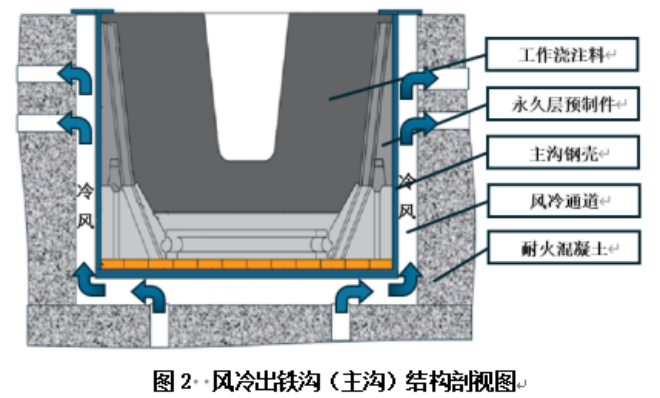 根據上述情況,聯合榮大專家組采用鋼殼風冷技術(見下圖2),提高了出鐵溝的安全性及壽命。該技術采取的措施:是在主溝鋼殼和耐火混凝土之間不作填充,留出空腔作為風冷通道,在溝底和溝幫上開設通風孔;鋼殼內部貼一層10mm厚的納米絕熱板,永久層采用高強度的大型預製塊進行拚裝,最後澆注主溝工作層。